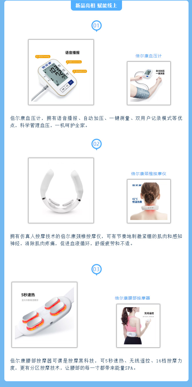 創新不止的倍爾康,產品研發不止步于體溫計,還包括了血壓計、按摩儀等產品,一起來看看吧!